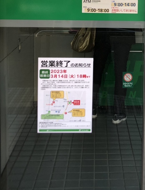 即、市の担当者に調べてもらいました。結果、不採算ATMの撤去は東関東一円で打ち出されている郵便局の方針で、幸手市のみが免れることのできないものであることが分かりました。昨日、貼り紙を確認に。銀行のATMと郵便局のATMを両方ご利用されている方に話しを聞くと、残念ですね、と。残念です…。