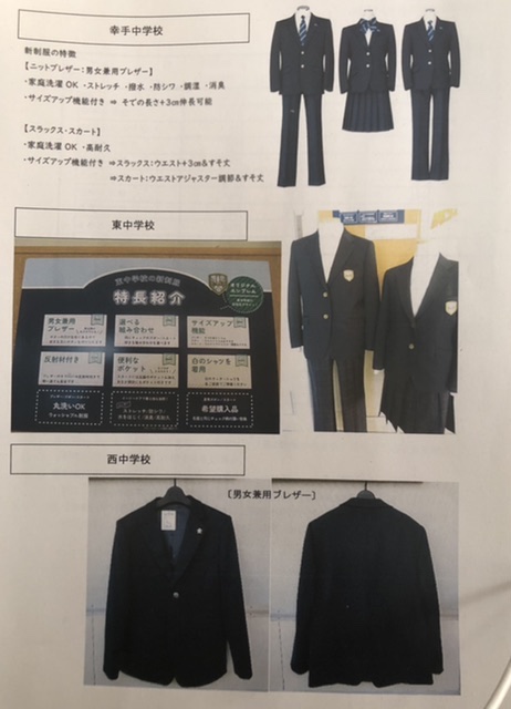ファイル 1957-1.jpeg教育委員会、各学校では、ジェンダーレスなどの社会変化への対応なども含め、昨年から制服の見直しに着手。関係者からご意見を聞いたりアンケート、試着会などを実施し、いよいよ来年6月下旬までにデザインや運用を決定し、令和6年度の入学生から着用となるようです。概要は、