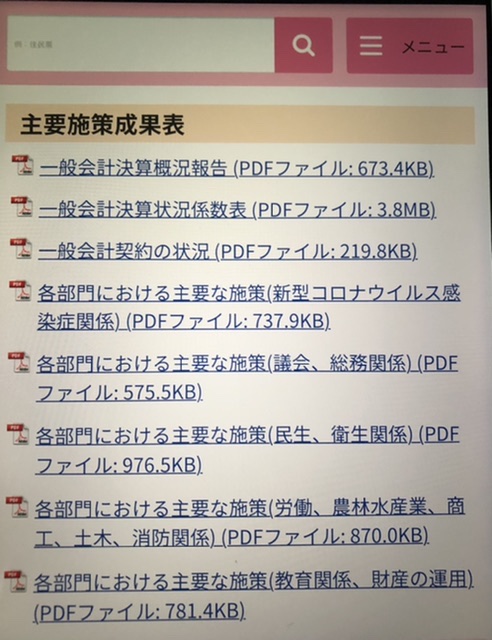 ◆決算書情報は財政課の報告。今、正にこれから議会で審議される資料です。数字がたくさん並んでいて取っ付きにくいと思う方もあるかと思いますが、お時間がありましたら、少しずつチャレンジしていただきたい情報です。資料としては、歳入歳出が費目毎に整理された決算書の他に、主要施策成果表があります。どんなことが載っているか。分解してご説明いたします。ご関心のある方はご覧にください。