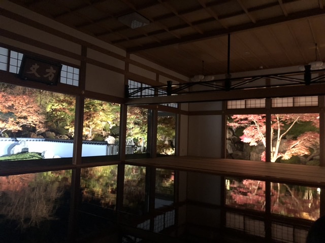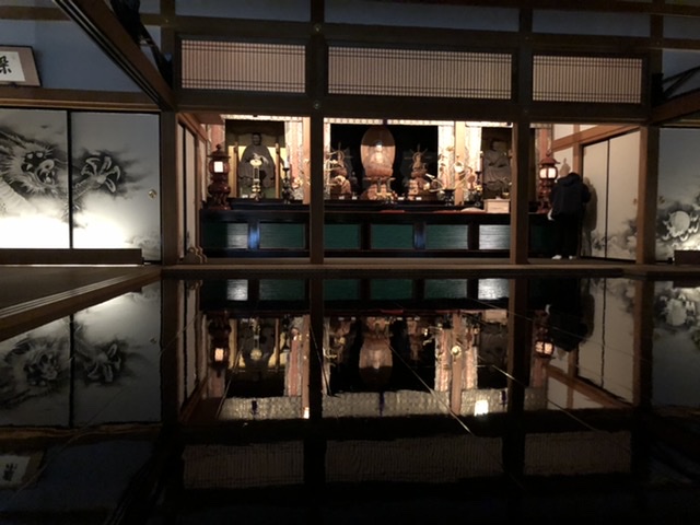 仏さまの祭壇の前に造られた板の間のピカピカの床にご本尊や本堂の周りに植えられた紅葉が映るしかけです。何とも幻想的な風情。禅寺でありながらたくさんの方に惜しげもなくこの風情を振舞うお寺の懐深さ…。写真にご本尊や紅葉が逆さに映っているのが見えますか?