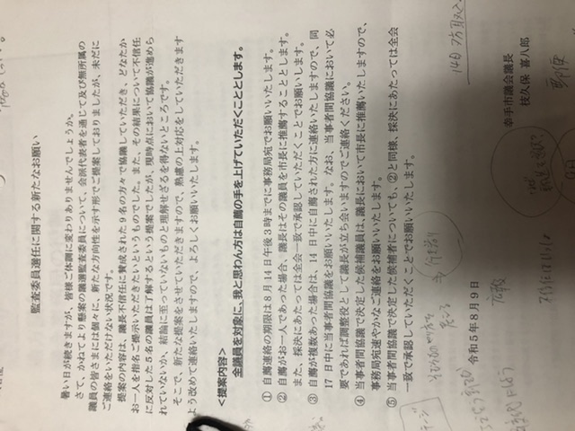 監査委員選出を巡り8月に動きがありました。まず、議長から、9人で決めたらコチラは追認するよ、と理解あり気ながら独善的な提案が郵送されてきました。議長としては苦肉の策の提案かも知れませんが、そもそも、不信任を可とした議員がこの提案に乗ると考えるならあまりに9人を軽んじる発想です。(いつものことながら、なぜか写真が縦にならず。また、文字が薄く見にくい状況で申し訳ありません)