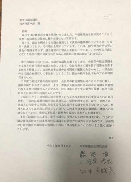 そもそも円滑な議会運営のためにある議長職を巡ってこれほどに議会を混乱させる事態は、幸手市議会として前代未聞の出来事であり、辞めない議長に辞める必要はないとのエールもありますが、多くの議員は戸惑いの中、すでに議会を代表する立場を失っている現状を議長に理解していただけるよう苦心しているのです。