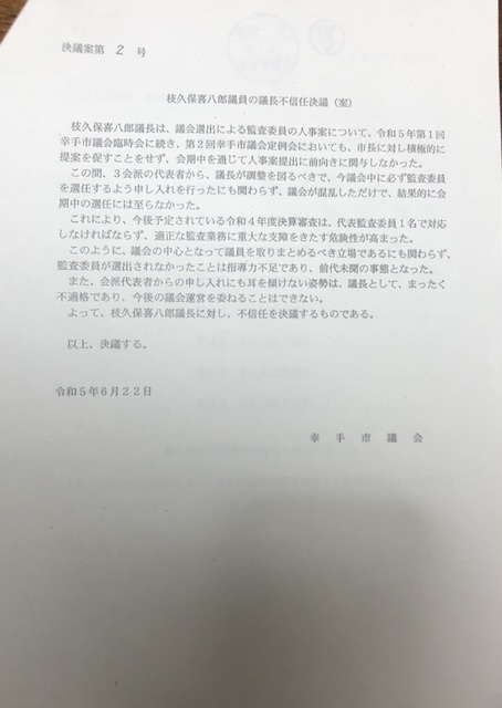 不信任決議の端緒は監査委員選出の不調整でありましたが、しかしそれ以上に大きな要素は独断的な議長の姿勢であり、自治の基本、民主的な議会が脅かされていることの是正です。