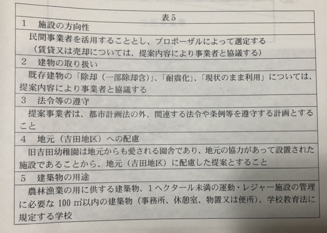 まず、庁内プロジェクトチームの検討では、様々な意見や提案がありましたが、都市計画法の規制が厳しいことなどから、公共施設としての再利用や新たな活用に向けた有効な提案はありませんでした。一方、事業提案会では、旧吉田幼稚園の施設利用について実現可能性のある具体的な提案があったため、民間事業者を活用し、今後プロポーザルによって選定することとなりました。