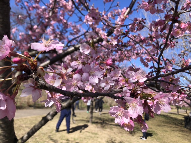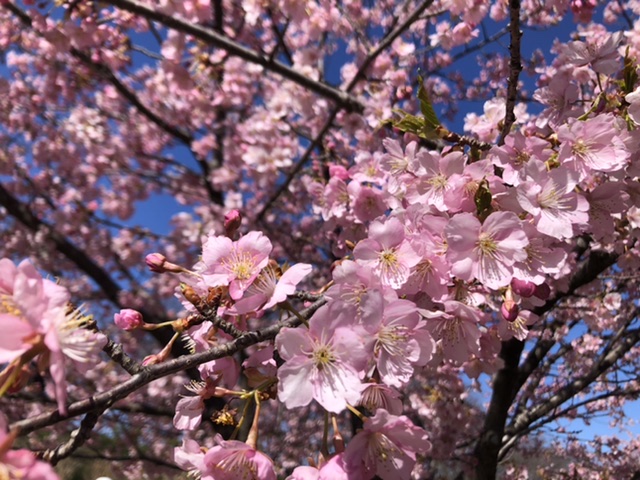 河津桜は堤の南側に並び今が見頃、満開ちょっと前という感じです。だんだん陽射しに暖かさを感じられる昨今、もし、お時間がありましたら是非観桜に。