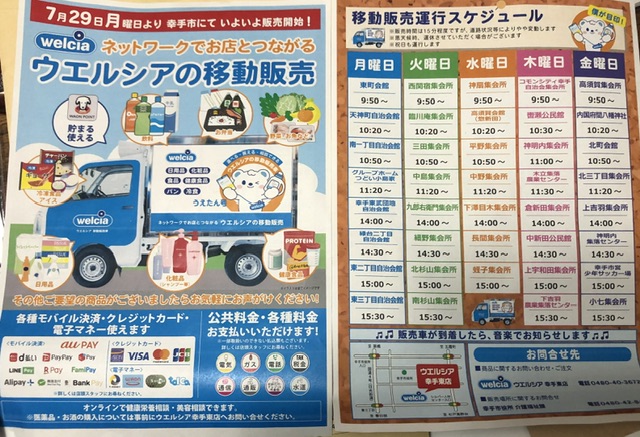 市民の皆さまの買い物のご不便を少しでも解消したいとする木村市長肝入りの施策です。ウエルシア幸手東店が旗艦店です。チラシに停留する集会所が掲載されていますのでお近くにお住まいの皆さまには是非、ご贔屓に。あるものは使うことで存続します。みんなで移動販売車をお育てください♪