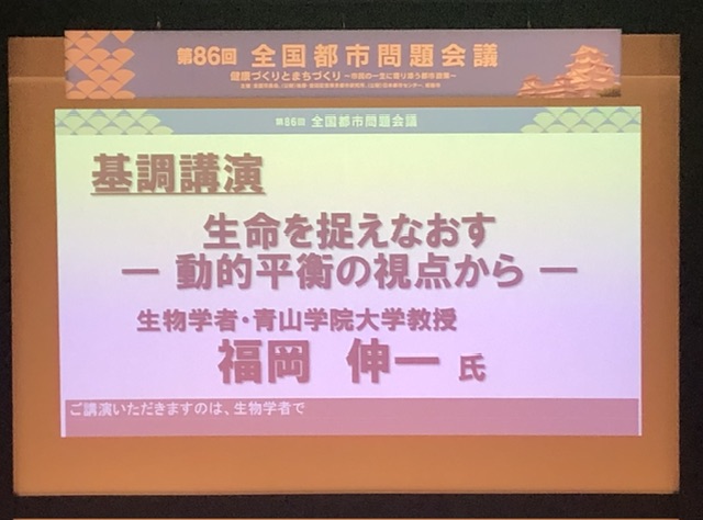 ファイル 2037-3.jpeg 1日目は、生物学者の福岡伸一青山学院大学教授の基調講演の後、一般報告として、千葉県流山市長、兵庫県立大学副学長のお話しがありました。私たちのカラダは日々細胞が生まれ変わっており、今の私は1年前の私とは別人である。生命をとらえ直そうと。