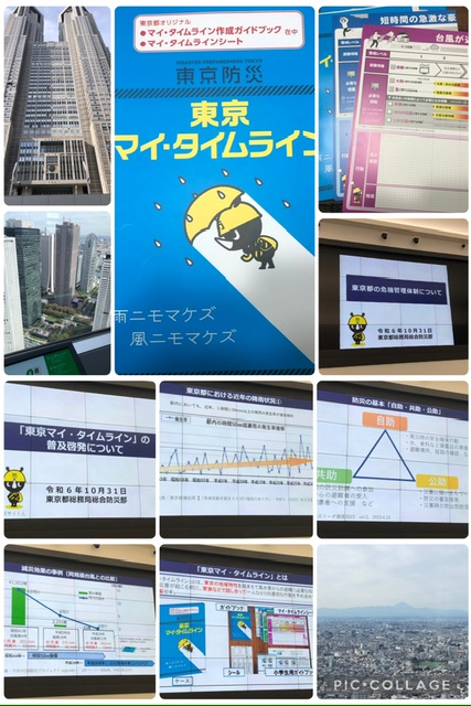 今回の視察テーマである「マイ・タイムライン」の普及啓発事業。どこの自治体でも水害や地震ハザードマップとセットでマイ・タイムライン普及啓発の取組は行われており、食料や水などの備蓄とともに究極の自助メニューですが、なかなかタイムライン作成を達成している方は少ないのではないかと推測します。恐らくそれは東京も同様で、住まい方の多様な全ての都民を行政がまもることは不可能だからこそ、より"自助"が強調されているように感じました。都庁展望台から眼下に広がる街は建物がぎっしりと詰め建ち並び、高層ビルが林立。もしもの大地震発生を想像して改めて自助の大切さを再認識した次第です。