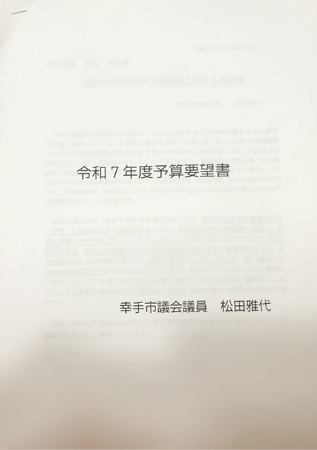 ファイル 2044-1.jpeg幸手市議会では、会派があれば会派で、無会派は個人で、市長に対し、来年度予算編成に合わせて要望書を提出することができます。私も一昨年度までは会派での要望でしたが、昨年度からは単独で提出しています。予算編成は市長の専権であり、予算そのものを要求することは難しいですが、市民の皆さまの健康や生活を向上させるサービスの方向性や検討材料を提示したつもりです。その内容についてご報告いたします。