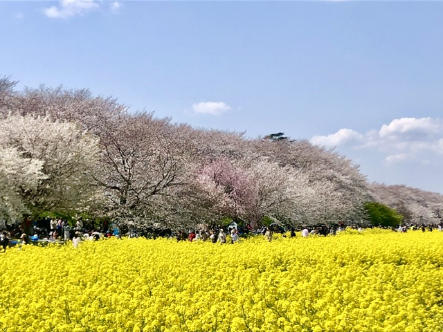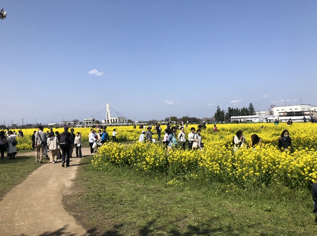桜土手だけでなく、第3公園にもキッチンカーが並び、第3公園から中川を挟んで見える対岸の権現堂堤は前面の菜の花畑越しに8分咲きほどに開花。菜の花の絨毯が圧巻です。