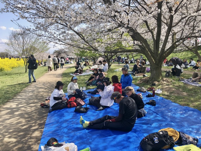 橋を渡り切ると桜の足元ではたくさんの人が思い思いにシートを敷いてお花見🌸🍡中。陰にいると少し肌寒さが残る中ではありましたが、土手の西側の屋台の芳ばしいニオイと相まって、普段の忙しさを忘れるゆったりとした時間が流れていました。