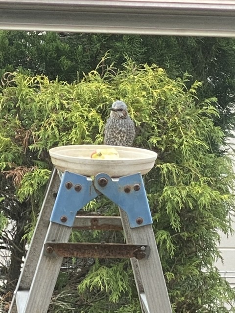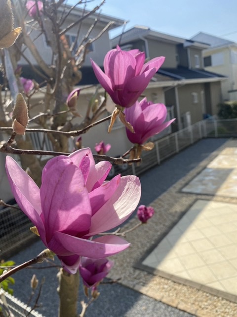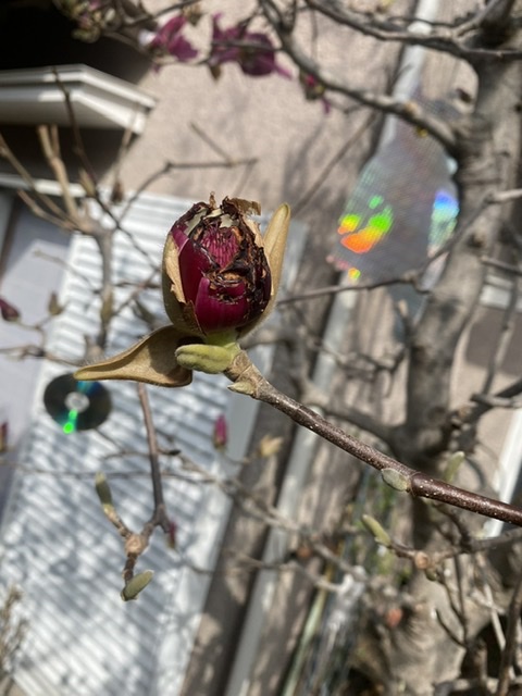 これはわが家の庭です。春は鳥との闘いで。モクレンの危機をリンゴを餌に防ぐの図。防ぎきれないとご覧の通り。毎年の攻防です😆
