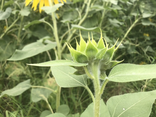 ただ、今回は綺麗なひまわりを真正面に見るだけではなく、少々ユニークな写真をラインナップしてみました。きっかけは、一緒に行った女性のちょっと変わったひまわり"LOVE"です。ひまわりは裏から見た姿が愛おしいのだと。それもツボミが開く前の。へーと、私も彼女が"頃合い"だとするツボミを撮ってみました。それがコレ。上の写真です。