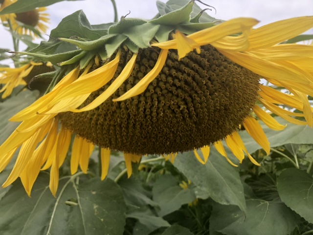 クリック➕二本指拡大でご覧ください。たくさんのタネでいっぱいの重い頭、しなりながら支える茎。あの小さな蕾の中にはこんな成長が詰まっている。タネを見て、「なんだ、終わりか」じゃないんですね。このタネの一つひとつに栄養を送る。そんな仕組みがあの小さな蕾に、茎に。すべては来年の"タネ"を育てるために。