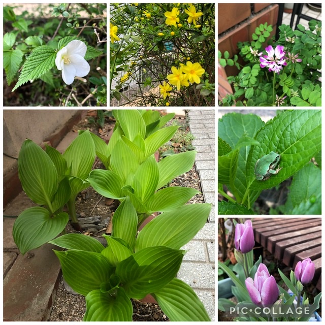 そして、わが家では白ヤマブキ、チューリップ などの花に混じってポットのレンゲも咲き出しました。ギボウシの若葉もキレイです。新芽の季節到来。冬眠明けのカエル もアジサイの葉に鎮座して。賑やかさを増す春をコラージュしてみました。ホッと一息、Blake Time。