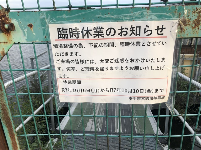 神扇釣り場は桟敷も広く大きな池で、どのような方策が取れるのか検討もつきませんが、水環境は釣り場の生命線です。老朽化で何でもやめてしまうのは簡単ですが、休日に例会や大会でたくさんのお客さまに親しまれた釣り場の復活に向け、担当職員にはよい解決策を模索して欲しいと願うばかりです。