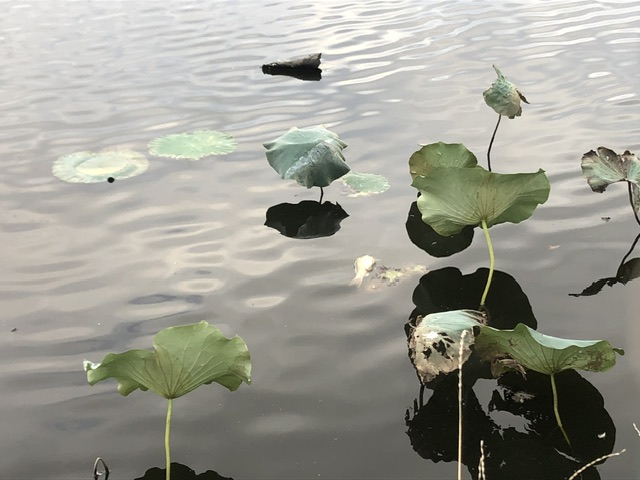 昨日の夕方、現場に行ってみました。水面は死魚の片付けも終わり何も無かったかのように穏やかに見えますが、ボートが入りにくい蓮の間には数匹の死魚が水面に浮かんでいました。作業を終え帰宅される管理者がおられたので少し事情をお聞きし、労を労わせていただきました。
